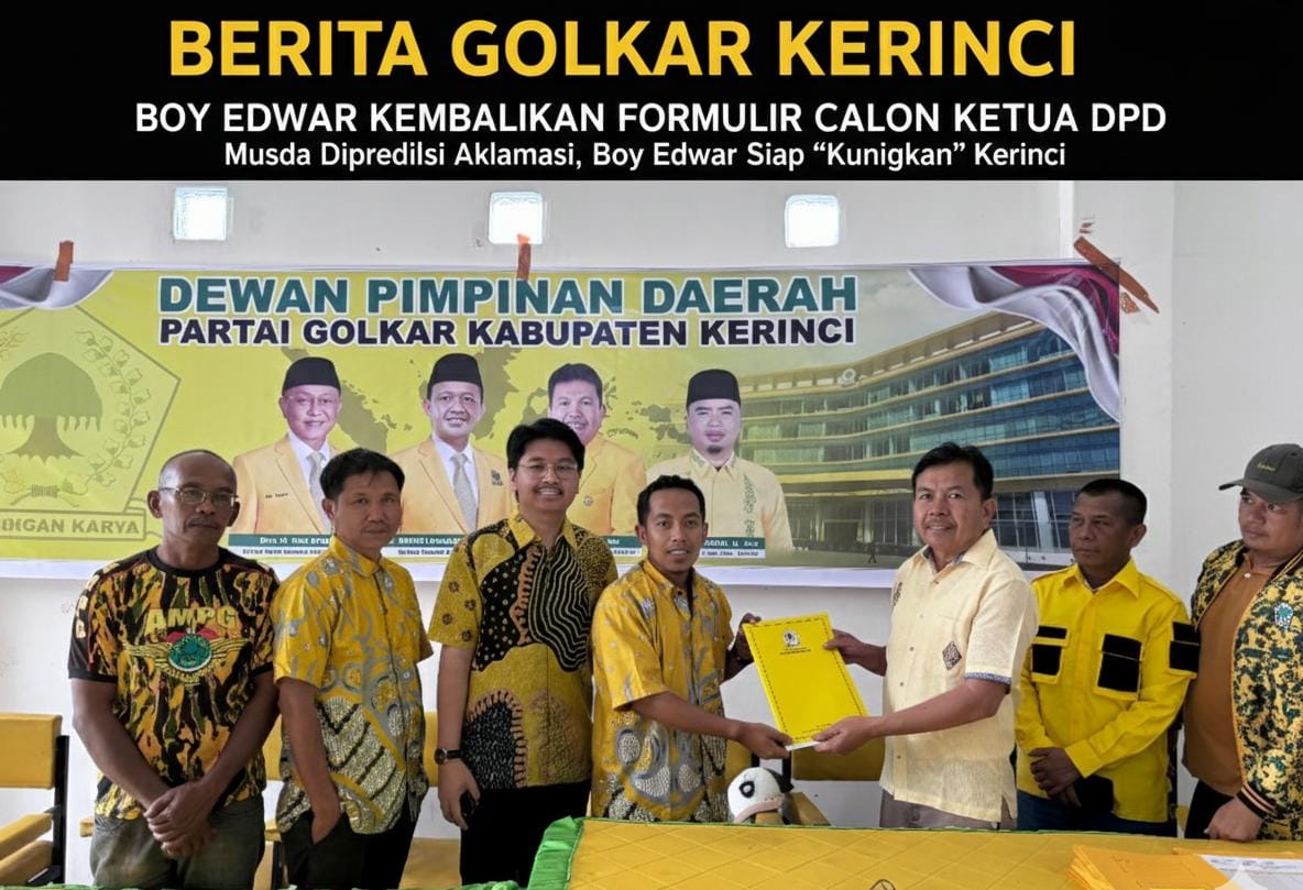 KERINCI – Langkah politik Boy Edwar menuju kursi kepemimpinan DPD II Partai Golkar Kabupaten Kerinci semakin mantap. Tepat pada Senin (09/02/2026), politisi senior sekaligus Wakil Ketua DPRD Kerinci ini resmi mengembalikan formulir pendaftaran bakal calon Ketua DPD Partai Golkar Kerinci periode 2026-2031.