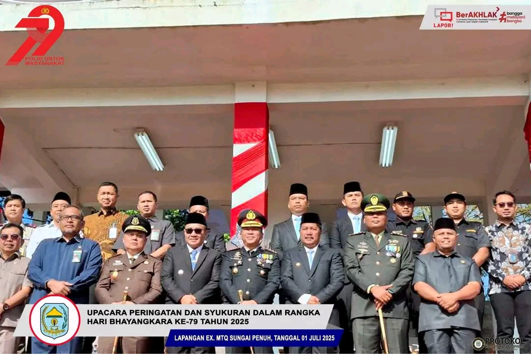 Sungai Penuh, 1 Juli 2025 – Bupati Kerinci, Monadi, S.Sos., M.Si, menghadiri upacara sekaligus syukuran dalam rangka peringatan Hari Bhayangkara ke-79 yang digelar oleh Polres Kerinci di Lapangan MTQ Kota Sungai Penuh, Selasa (1/7/2025). Upacara berlangsung dengan khidmat dan penuh semangat, dihadiri oleh jajaran Forkopimda, tokoh masyarakat, tokoh agama, serta berbagai elemen masyarakat.