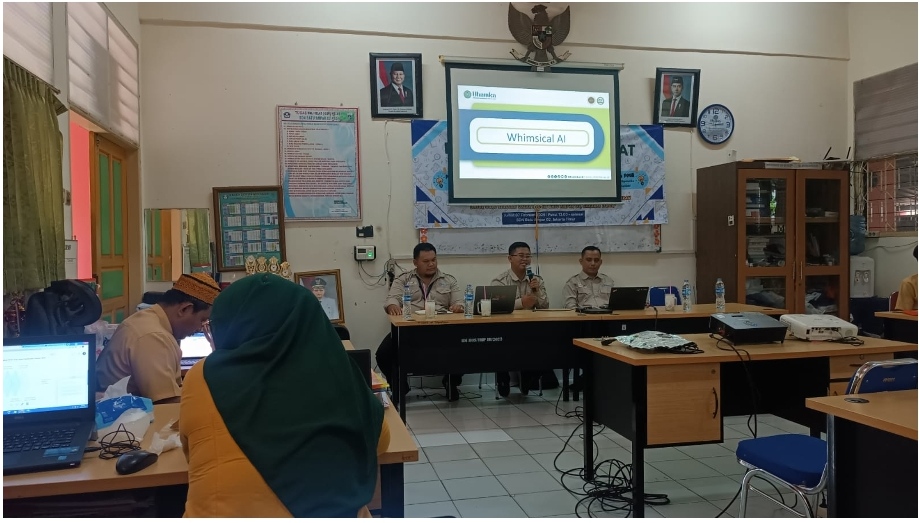 Pada kegiatan diawali pembukaan oleh wakil kepala sekolah SD Negeri 02 Batu Ampar dan dilanjutkan materi yang di moderator oleh Khavisa,M.Pd. Adapun kegiatan ini disajikan dalam dua materi yaitu materi pertama oleh Diki Rukmana,M.Pd tentang pemanfaatan AI dalam pembuatan bahan ajar. Dalam materi ini diperkenalkan tiga jenis platform AI seperti Napkin AI, ChatGPTdan Bing Image AI. Masing-masing platform AI ini sangat bermanfaat dalam mendukung pembuatan bahan ajar. Contoh Napkin AI digunakan merubah teks menjadi infografis yang menarik dan komunkatif, sementara itu ChatGPT yang biasa digunakan untuk memberikan materi pembelajaran lengkap dan mendalam sesuai kebutuhan dan jenjang kelas. Sedangkan, Bing Image AI untuk membuat cover buku menarik berdasarkan deskripsi teks yang diberikan. Diakhir materi pertama guru langsung diarahkan untuk mencoba simulasi dari tiga platform AI. Selanjutnya, materi kedua oleh Zulherman,Ph.D tentang pembuatan peta konsep menggunakan whimsical AI. Penggunaan platfotm AI whimsical ini sangat berguna untuk membantu para guru dalam mendesain materi pelajaran menjadi ringkas dan mudah dimengerti oleh siswa. Penggunaan whimsical AI nanti juga bisa digunakan oleh siswa dalam mengerjakan tugas sekolah dan pastinya digunakan untuk mensederhanakan materi-materi pembahasan pelajaran. Jadi kesimpulannya guru dan siswa bisa menggunakan whimsical untuk keperluan sekolah. Setelah materi, guru-guru diarahkan untuk mempraktekan pembuatan peta konsep menggunakan whimsical AI.
