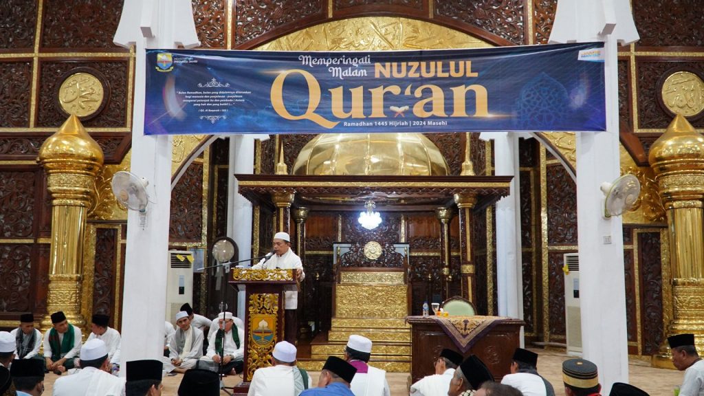 “Marilah kita semua selalu memanjatkan puji dan syukur kehadirat Allah SWT, atas rahmat dan maghfiroh-Nya kita masih diberi kesehatan, kesempatan dan kekuatan, untuk dapat hadir melaksanakan sholat Isya dan tarawih berjamaah serta bersilaturahmi dalam rangka melaksanakan dan mengikuti Peringatan Nuzul Qur’an Tahun 1445 H/2024 M di Masjid Agung Al-Falah Provinsi Jambi ini,” ujar Gubernur Al Haris.