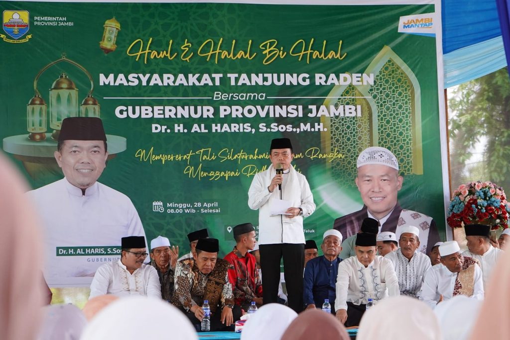 JAMBI – IDEAA.ID || Gubernur Jambi Dr. H. Al Haris, S.Sos, MH, menyampaikan, Seberang Kota Jambi (Sekoja) sudah dikenal semenjak dulu adalah Kota Santri, karena seberang ini adalah pusatnya sekolah agama Islam, madrasah dan pondok pesantren tertua, banyak sekali santri-santri yang lahir dari Seberang Kota Jambi ini, sampai saat ini masih banyak melahirkan santri-santri yang memahami agama. Hal tersebut disampaikan Gubernur saat menghadiri Haul dan Halal Bihalal bersama masyarakat Tanjung Raden, bertempat di Madarasah Sa’adatul Ulya Kelurahan Tanjung Raden Kecamatan Danau Teluk Seberang Kota Jambi, Minggu (28/04/2024).