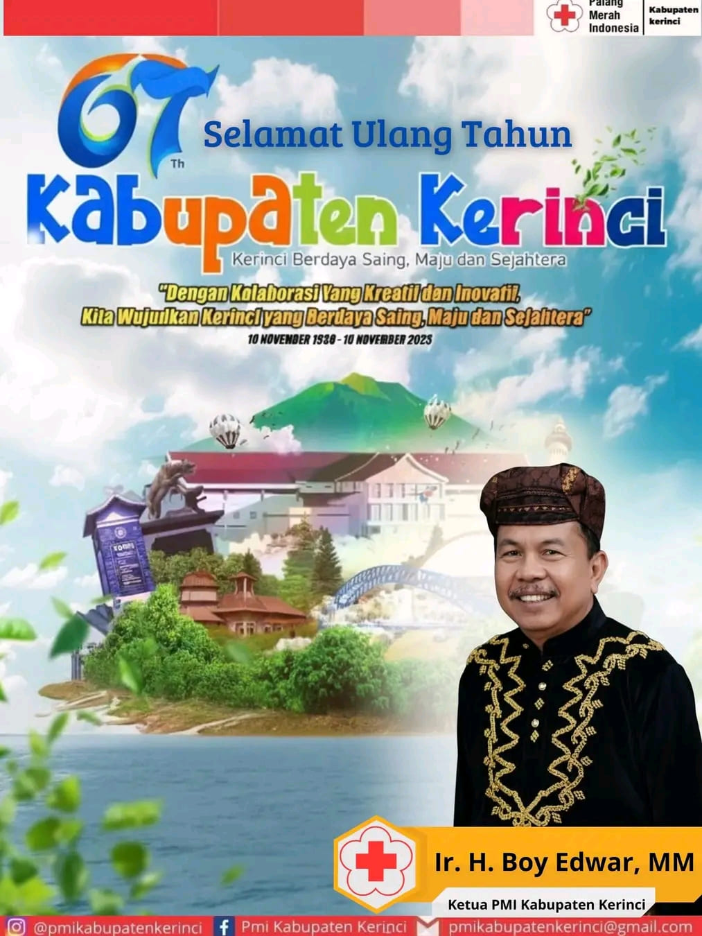 Kerinci, 10 November 2025 – Peringatan Hari Ulang Tahun Kabupaten Kerinci yang ke-67 turut disemarakkan dengan ucapan penuh makna dari Ketua Palang Merah Indonesia (PMI) Kabupaten Kerinci, Ir. Boy Edwar. Atas nama Keluarga Besar PMI Kerinci, beliau menyampaikan selamat dan doa terbaik bagi kemajuan Bumi Sakti Alam Kerinci.