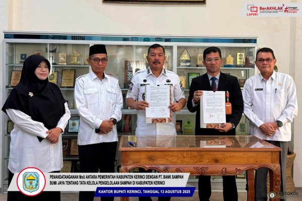 KERINCI – Rabu (13/8/2025), Bupati Kerinci, Monadi, S.Sos., M.Si., melakukan penandatanganan dua Nota Kesepahaman (MoU) penting yang diharapkan membawa dampak positif bagi pembangunan daerah. Pertama, MoU antara Pemerintah Kabupaten Kerinci dengan PT. Bank Sampah Bumi Jaya tentang tata kelola pengelolaan sampah di Kabupaten Kerinci. Kerja sama ini bertujuan untuk meningkatkan kesadaran masyarakat dalam mengelola sampah…