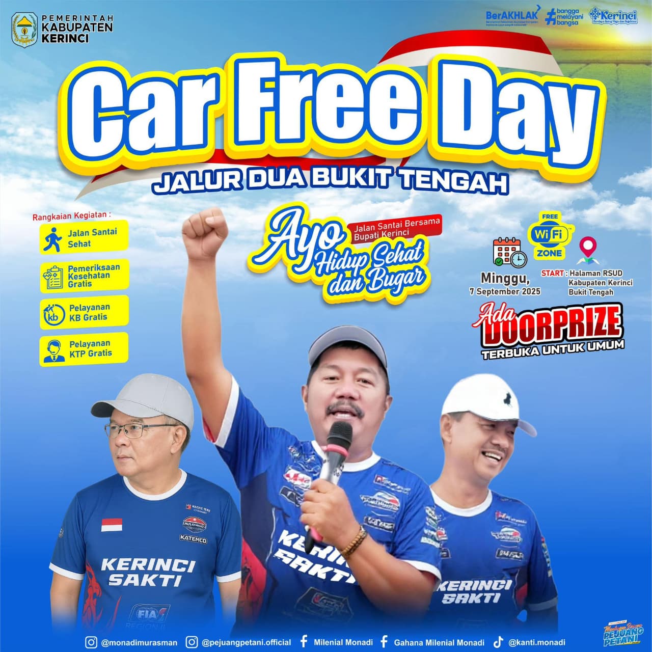 Kegiatan ini terbuka untuk umum dan mengajak seluruh masyarakat Kabupaten Kerinci untuk hadir bersama keluarga. Selain jalan sehat, panitia menyiapkan doorprize menarik, pemeriksaan kesehatan gratis, pelayanan KTP, serta pelayanan KB gratis bagi masyarakat.