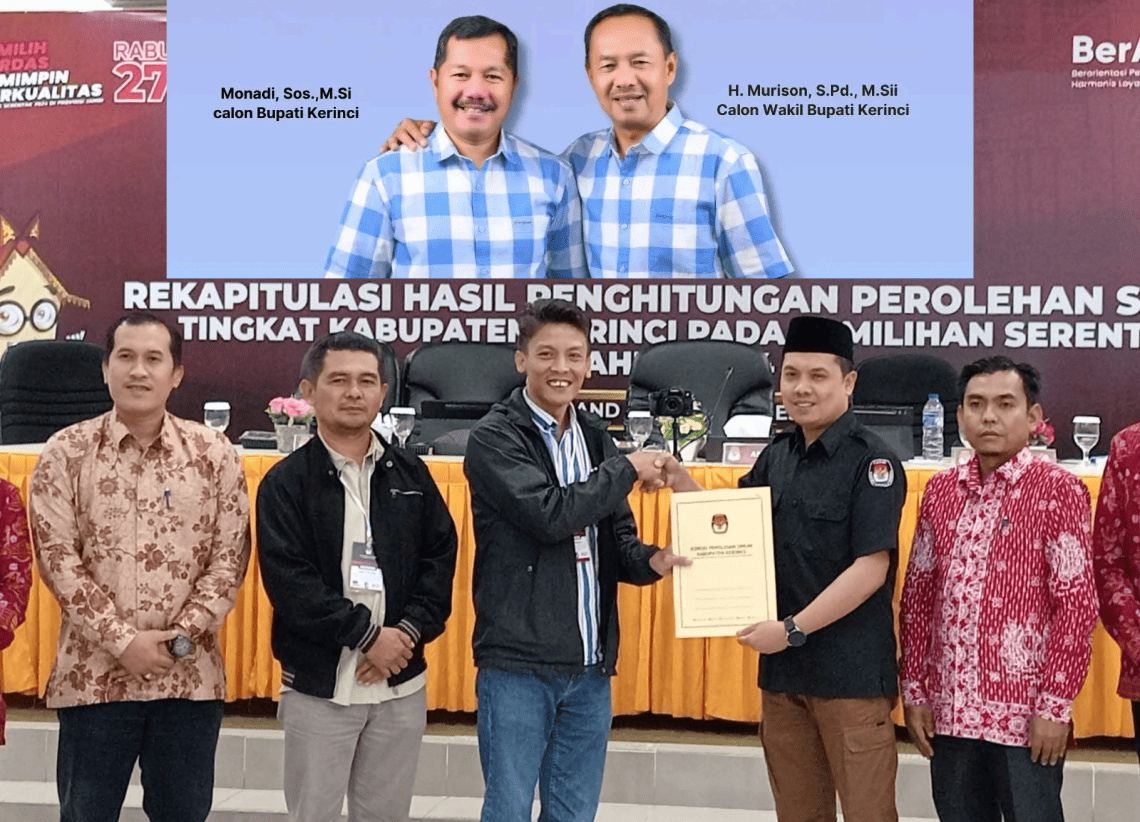 KERINCI – IDEAA.ID || Komisi Pemilihan Umum (KPU) Kabupaten Kerinci resmi menetapkan pasangan calon (paslon) Monadi-Murison sebagai peraih suara terbanyak dalam Pemilihan Kepala Daerah (Pilkada) Kerinci yang telah berlangsung beberapa waktu lalu.