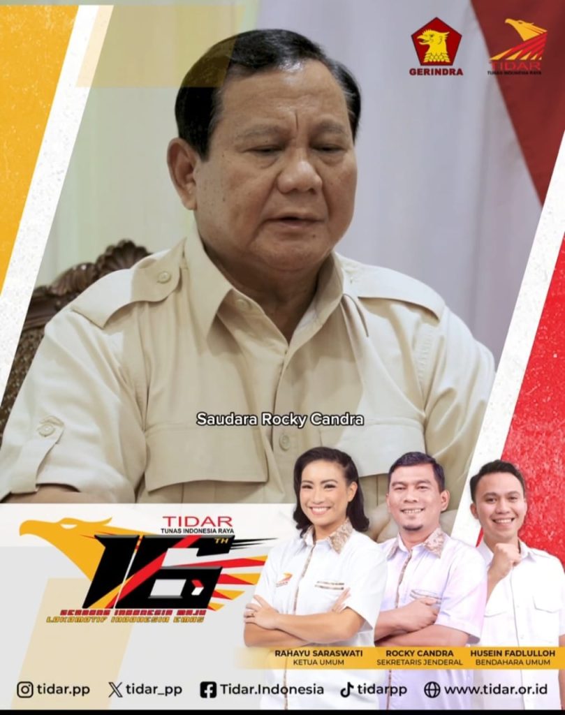 Presiden RI terpilih, Prabowo Subianto yang juga sebagai Ketua Umum Partai Gerindra, mengucapkan selamat kepada Rocky Chandra, Sekretaris Jendral Pimpinan Pusat Tunas Indonesia Raya (PP TIDAR) terpilih menjadi Anggota DPR-RI pada Pemilihan Legislatif 2024 ini. Video ucapan tersebut disampaikan oleh Prabowo saat memberikan sambutan pada puncak Milad Tidar ke-16, dan video ucapan tersebut disebarkan serentak oleh seluruh Kader Tidar se-Indonesia.